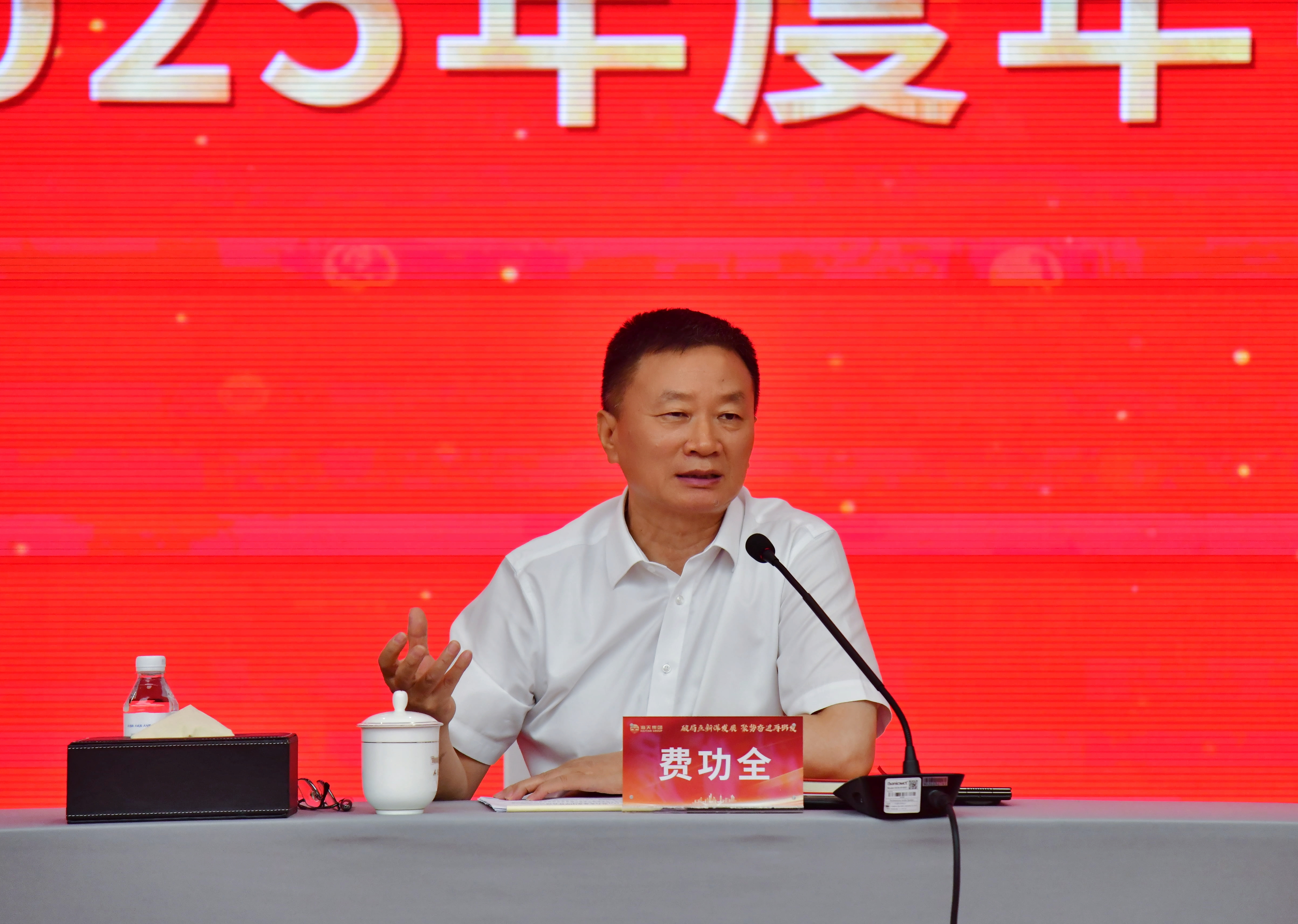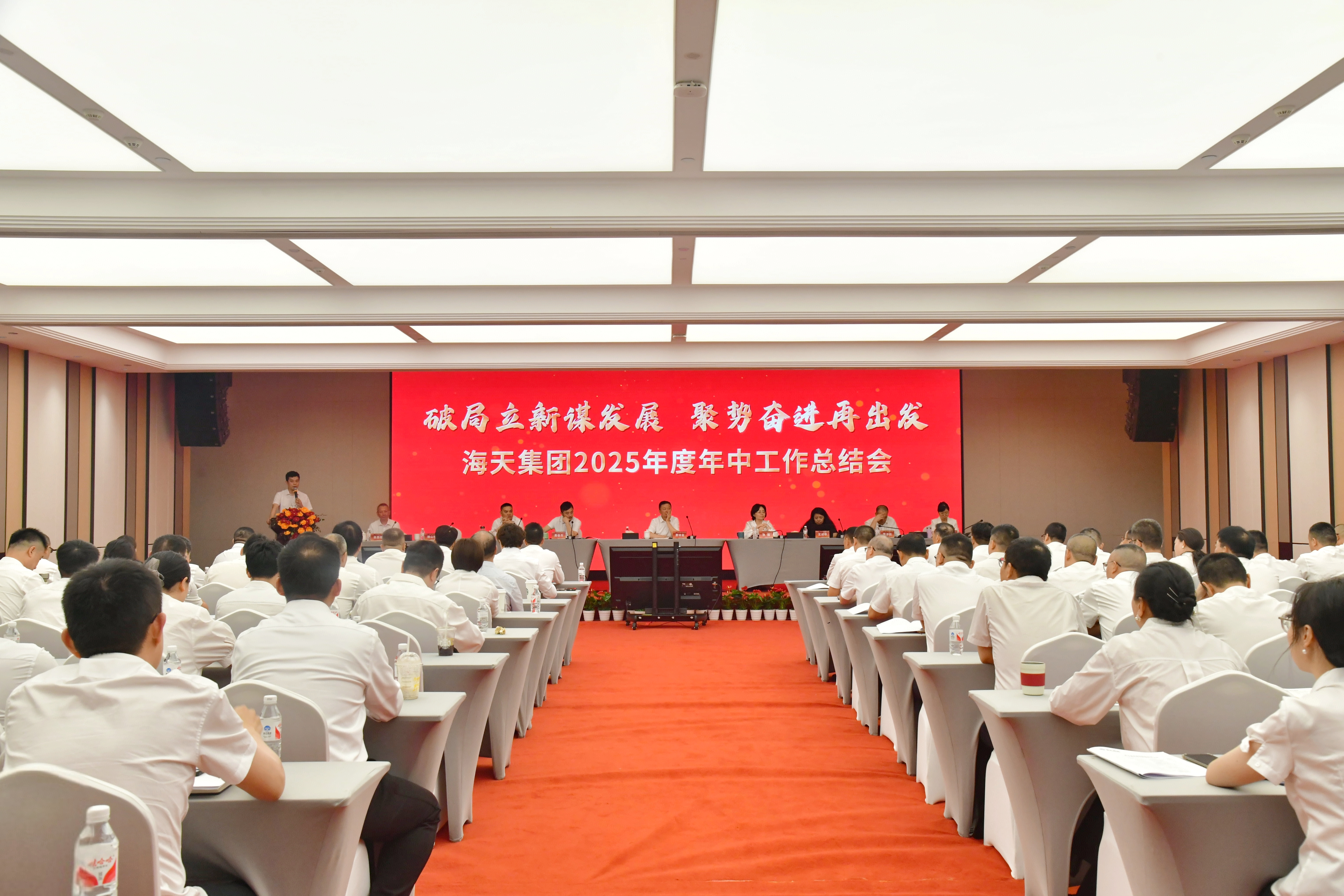 8月2日,海天集团召开2025年度年中工作总结会,会议以“破局立新谋发展 聚势奋进再出发”为主题,全面回顾总结集团上半年工作成果,深入剖析当前面临的机遇与挑战,安排部署下半年重点工作。海天集团董事长费功全,海天股份董事长、党委书记张霞,海天股份总裁费俊杰出席会议并讲话。集团领导,集团部长级及以上管理干部,下属子公司经营班子成员,管培生代表参加会议。